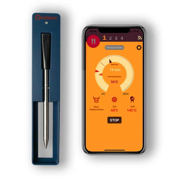 | Das Scaleson Grill- und Bratenthermometer S410 eignet sich hervorragend für die Temperaturmessung Ihres Grillguts. Durch die kabellose Übertragung der Messwerte gehört lästiger Kabelsalat der Vergangenheit an. So können Sie auch problemlos den Garpunkt Ihres Grillgutes an einem Drehspieß überwachen. Durch diese sehr traditionelle Grillart, können passionierte Grillfans schmackhafte neue Gerichte kreieren. | Auch heute noch stehen an Fest- oder Sonntagen köstliche Braten hoch im Kurs. Familien- & Freundestreffen – die Zeit des gemütlichen Beisammenseins an einer vollen Tafel in guter Gesellschaft und mit saftigen Braten und festlichen Gerichten. Mit dem Scaleson Grill- und Bratenthermometer S410 können Sie diese gemeinsame Zeit in vollen Zügen genießen und den Garvorgang jederzeit über die App auf Ihrem Mobiltelefon überwachen. Sie werden mittels eines Alarms darauf hingewiesen, dass Ihr Braten die voreingestellte Temperatur erreicht hat und zum Servieren bereit ist. | Um ein optimales Geschmackserlebnis zu erzielen reicht es nicht aus nur auf qualitativ hochwertige Zutaten zu achten. Es ist genauso wichtig die richtige Garmethode anzuwenden und dabei die optimale Garzeit zu wählen. Das Grill- und Bratenthermometer und die dazugehörige App ermöglichen es Ihnen den Garvorgang zu überwachen. Sie können aus bereits hinterlegten Gerichten wie beispielsweise “Rind Medium Done” wählen und werden per Alarm darüber informiert, dass der Garprozess abgeschlossen ist. Alternativ haben Sie auch die Möglichkeit selbst einen Timer zu stellen oder sich nur die aktuelle Temperatur anzeigen zu lassen. |